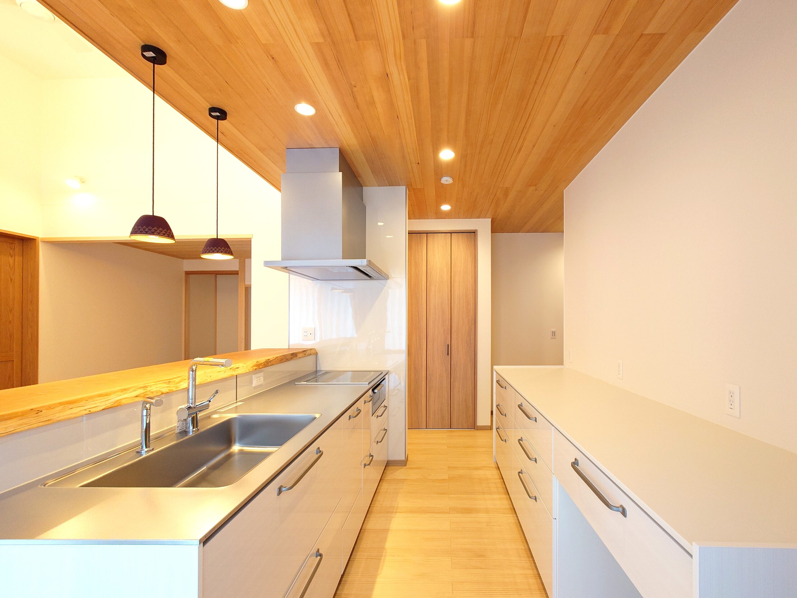 天井にはアクセントで木を貼っており、安水建設が得意とする木を感じられる和モダンテイストに仕上がっております。