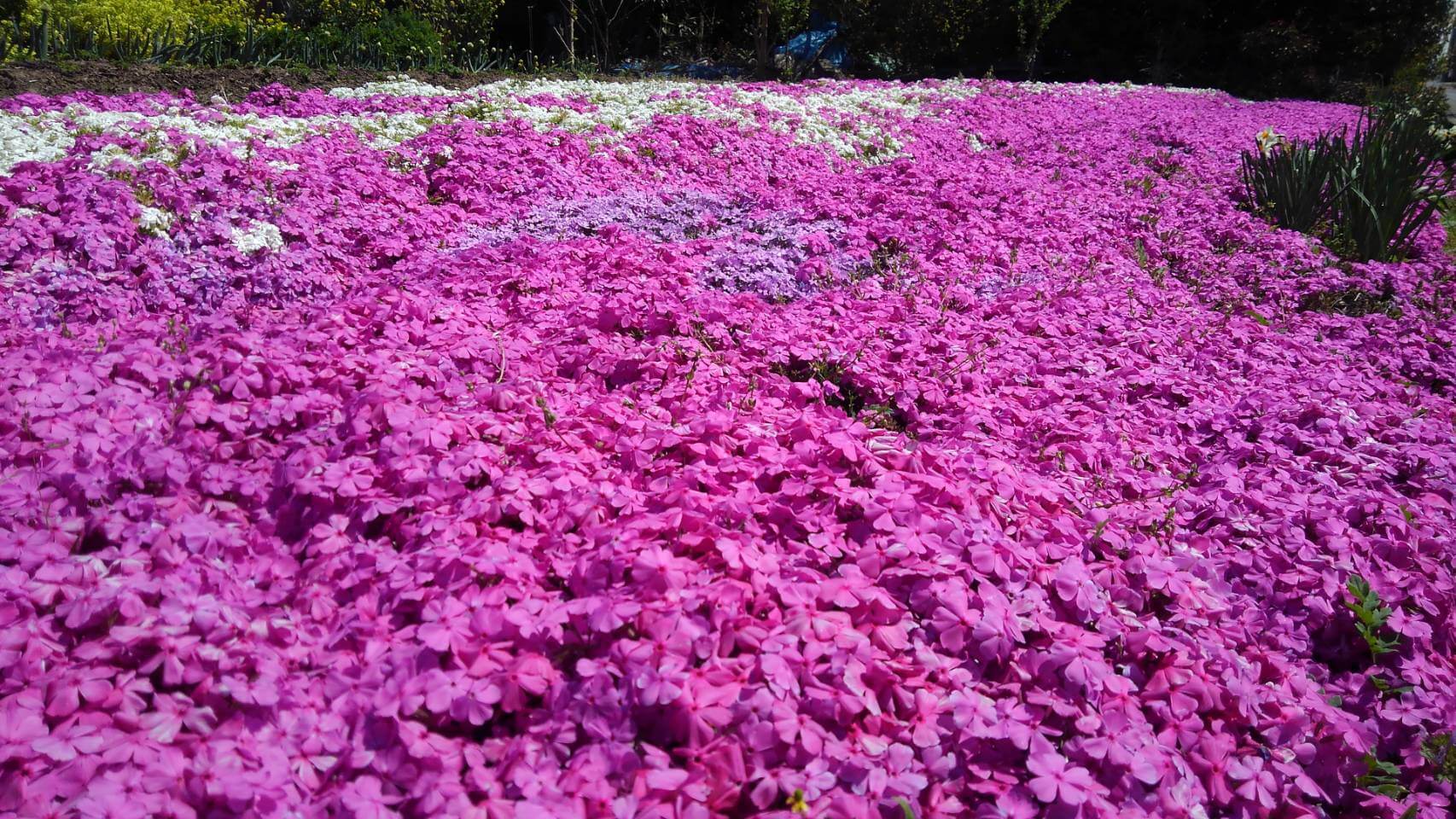 葉桜が目立つようになって、桜が少し前までは満開だったのになと少しさみしく思っていたのですが、ビビットピンクの桜が満開でした!現場近くの芝桜です。