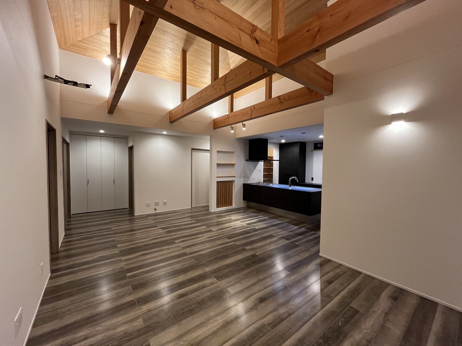 今回のお宅はリビングの大きな吹抜けと梁が特徴的でしたが形が複雑で少々苦労しました。