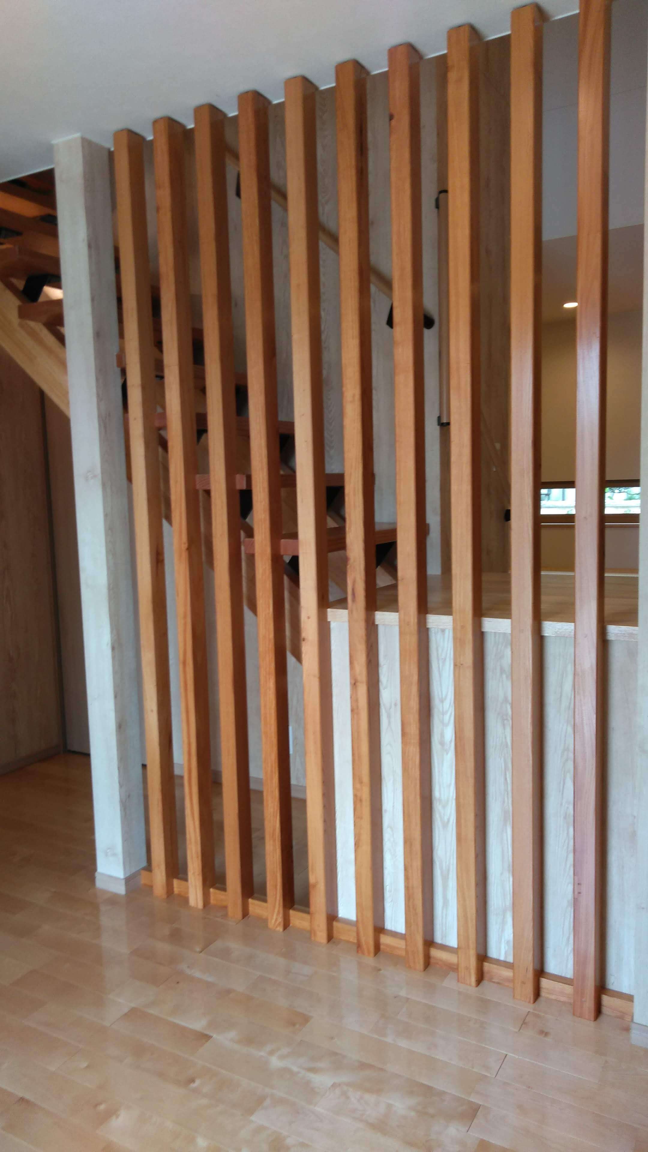 階段が透けて見える縦格子…実は建替え前に住まわれていたお家の材料の一部なんです。