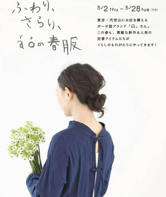 5月のくらしのものがたりは『ふわり、さらり、aoの春服』フェアを開催しております♪