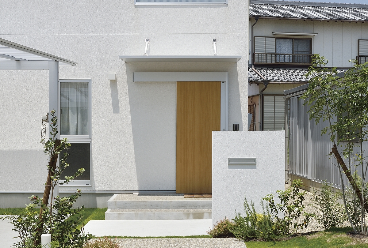 白をベースとして、玄関ドアに木目を選び、色を使いすぎないようにしました。 木の素材を見せることで、シンプルモダンにナチュラルさをプラスことができます。 (写真はイメージです)