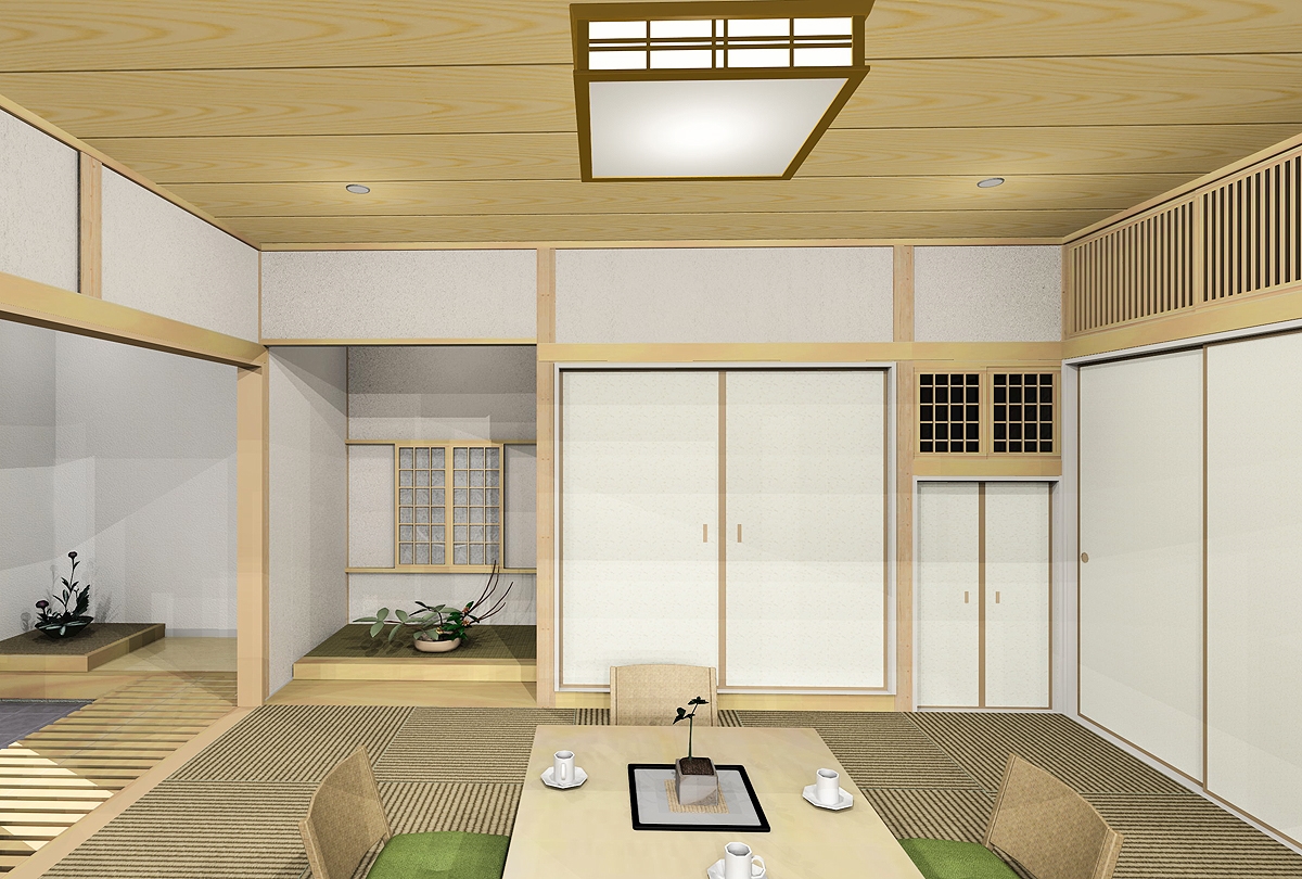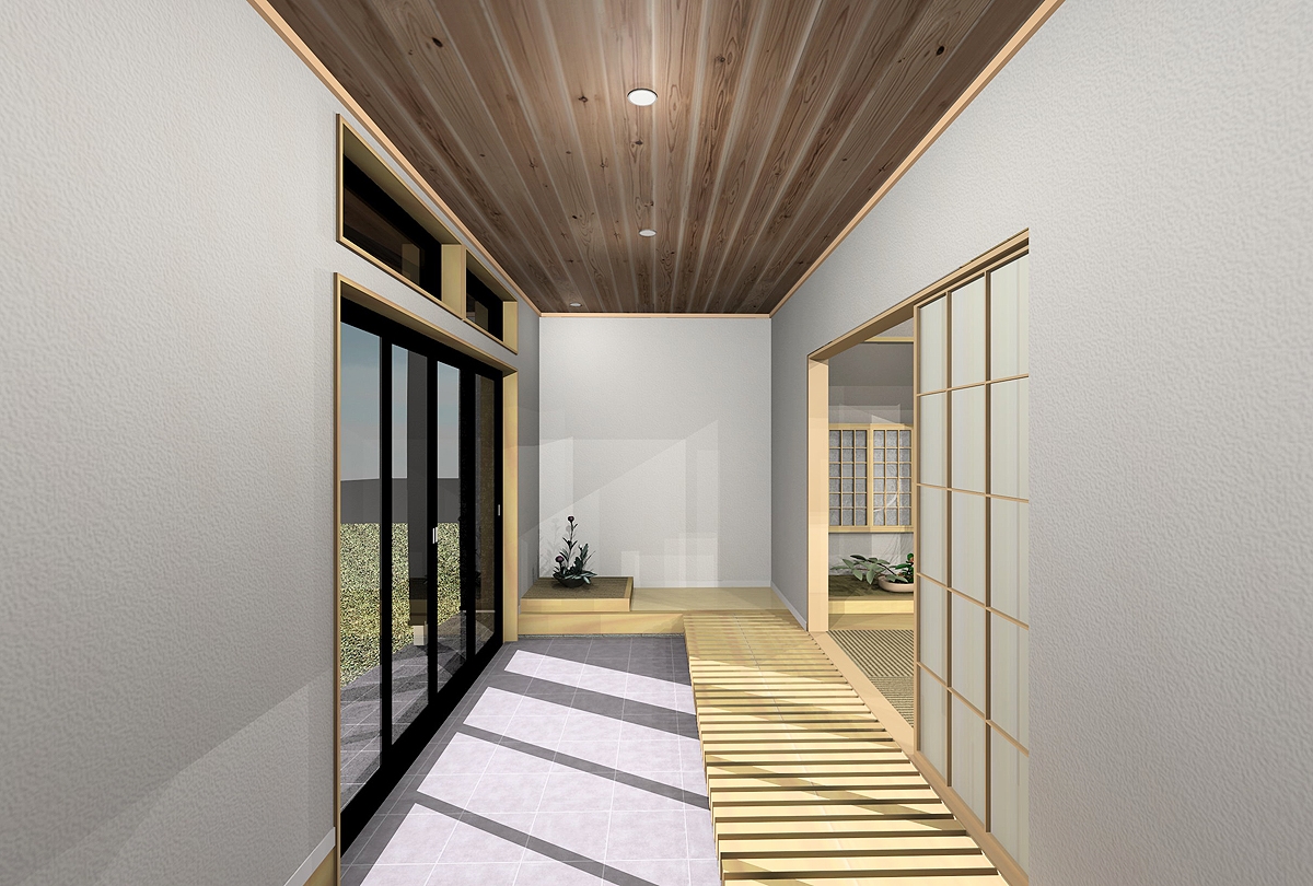 広い土間と繋がる本格和室をご提案。 床の間には丸窓を採用し、和モダンな雰囲気を味わうことができます。