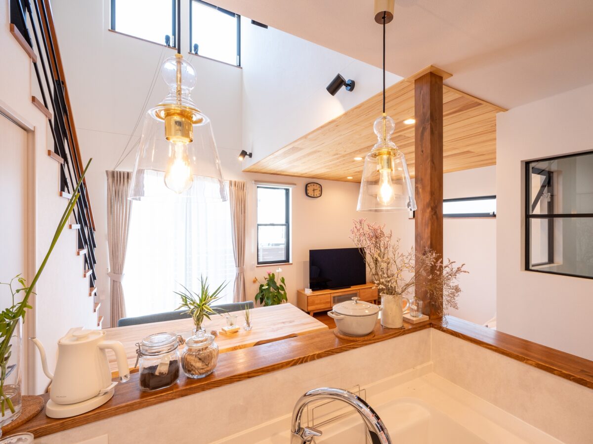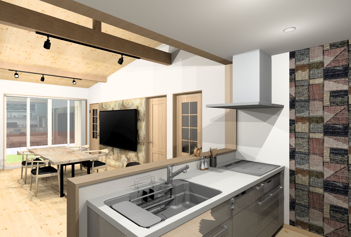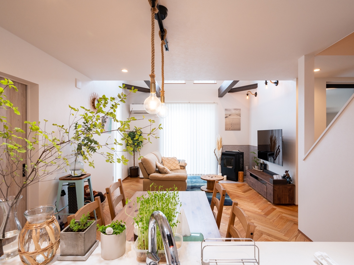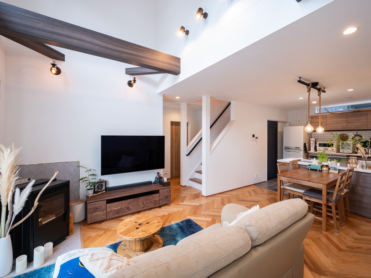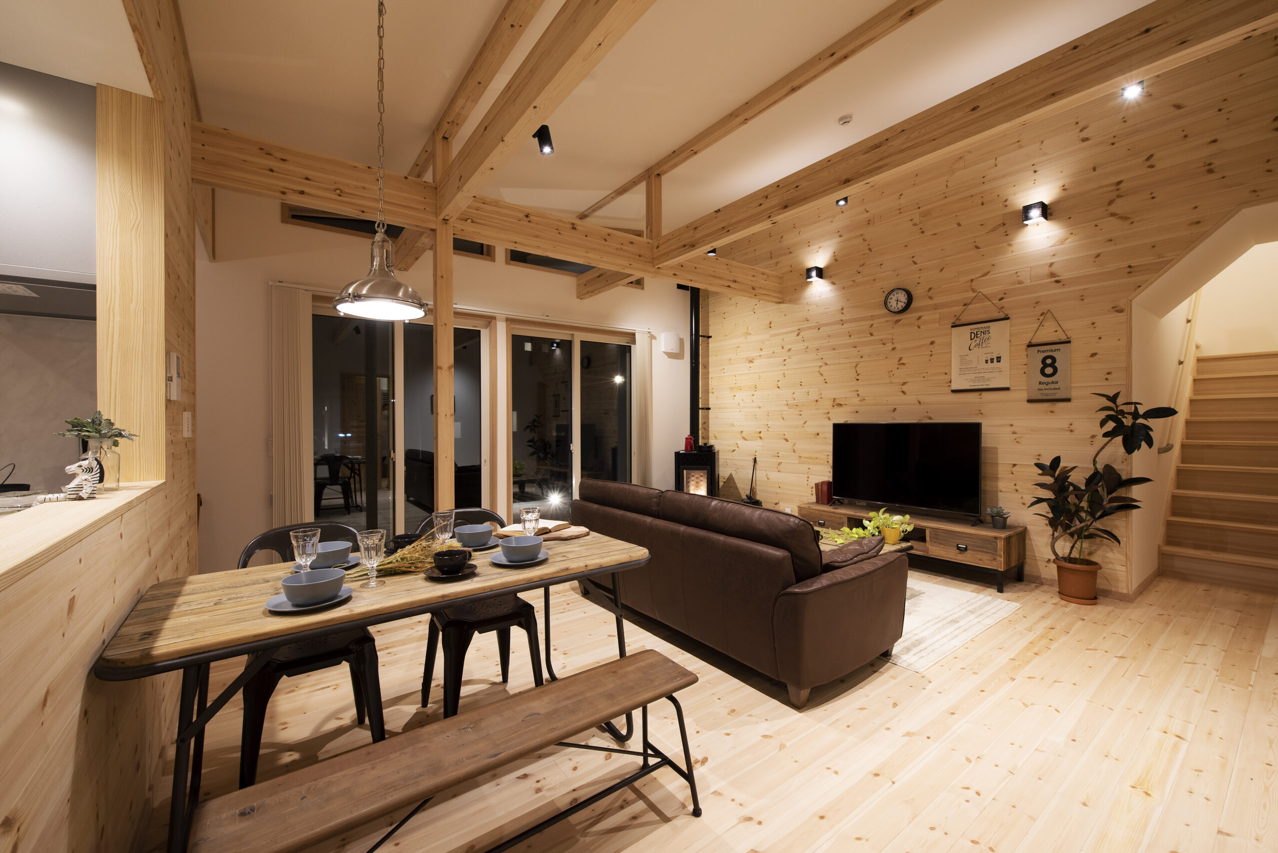板張り天井と化粧梁が魅力的な開放感たっぷりの広々とした空間になっています。 木の素材感やぬくもりが感じられ、心地よさに包まれるLDK空間に仕上がりました。