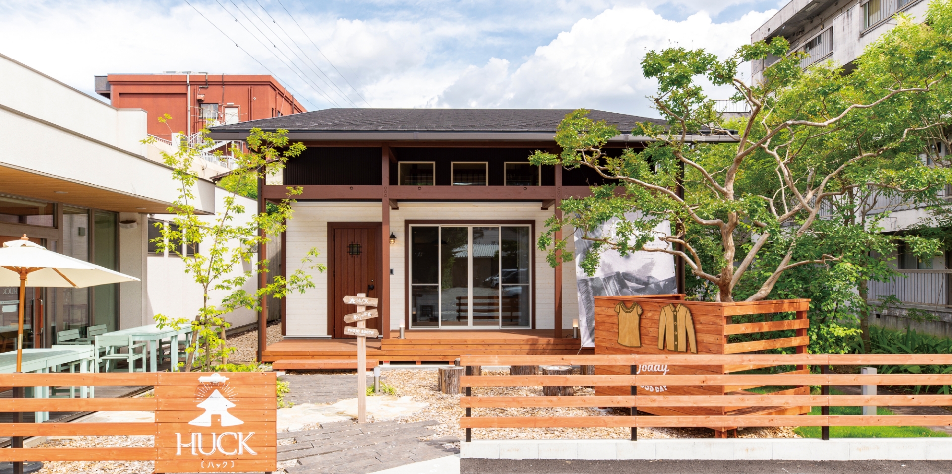 HUCKは、ウッディな空間の心地よさを堪能する本物の木の家。床や梁、室内の壁はもちろん、外壁やウッドデッキなどの外構などふんだんに天然素材の木材を使用しています。