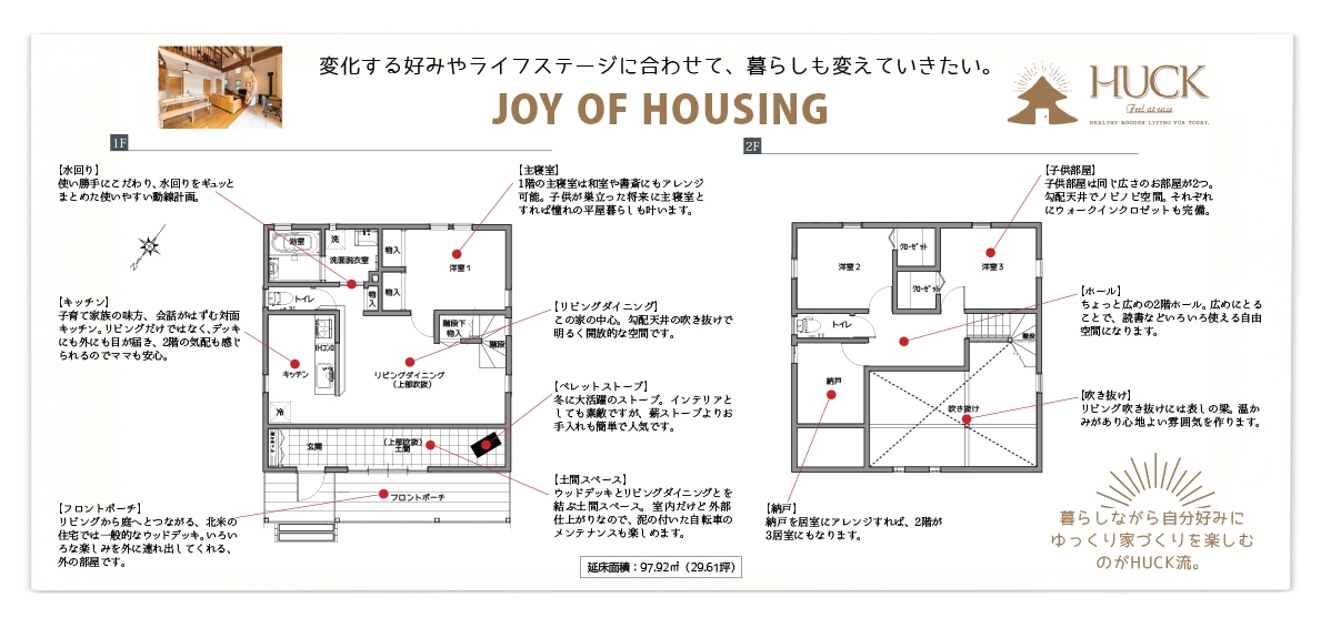 HUCKは日々の暮らしに“くつろぎ”と“心地よさ”を生み出す住まい。家族が一緒におうち時間を楽しむ家としての空間づくりを提案しています。
